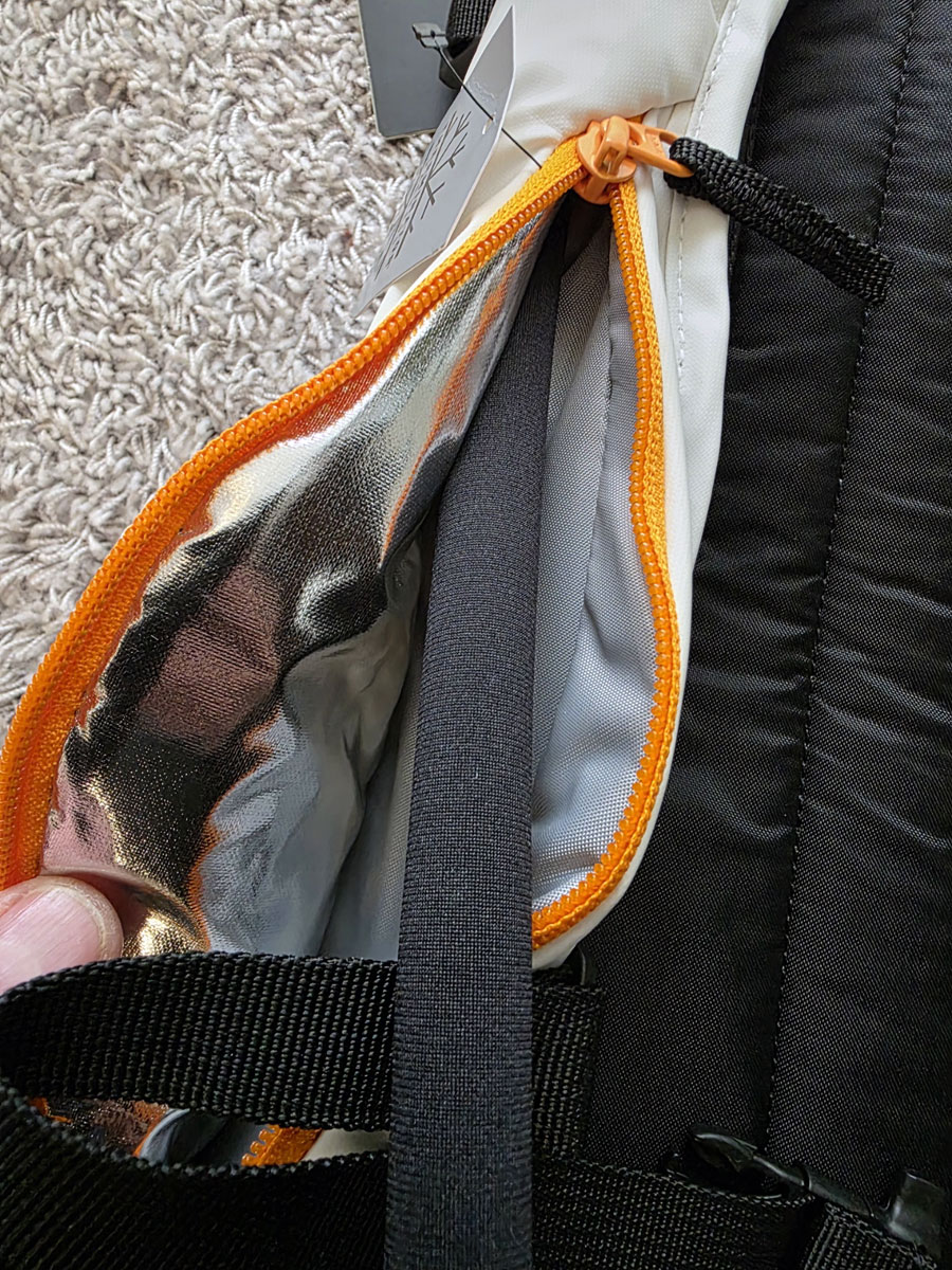 Neben dem Snowboard lassen sich auch Ski sowohl über Kreuz als auch vertikal befestigen. Ein abnehmbarer Stabilitätsgurt sowie eine Helmhalterung vervollständigen die Ausstattung. Im Inneren befinden sich speziell geformte Fächer für Schaufel, Sonde und Notfallset geformte Bereiche vorhanden.