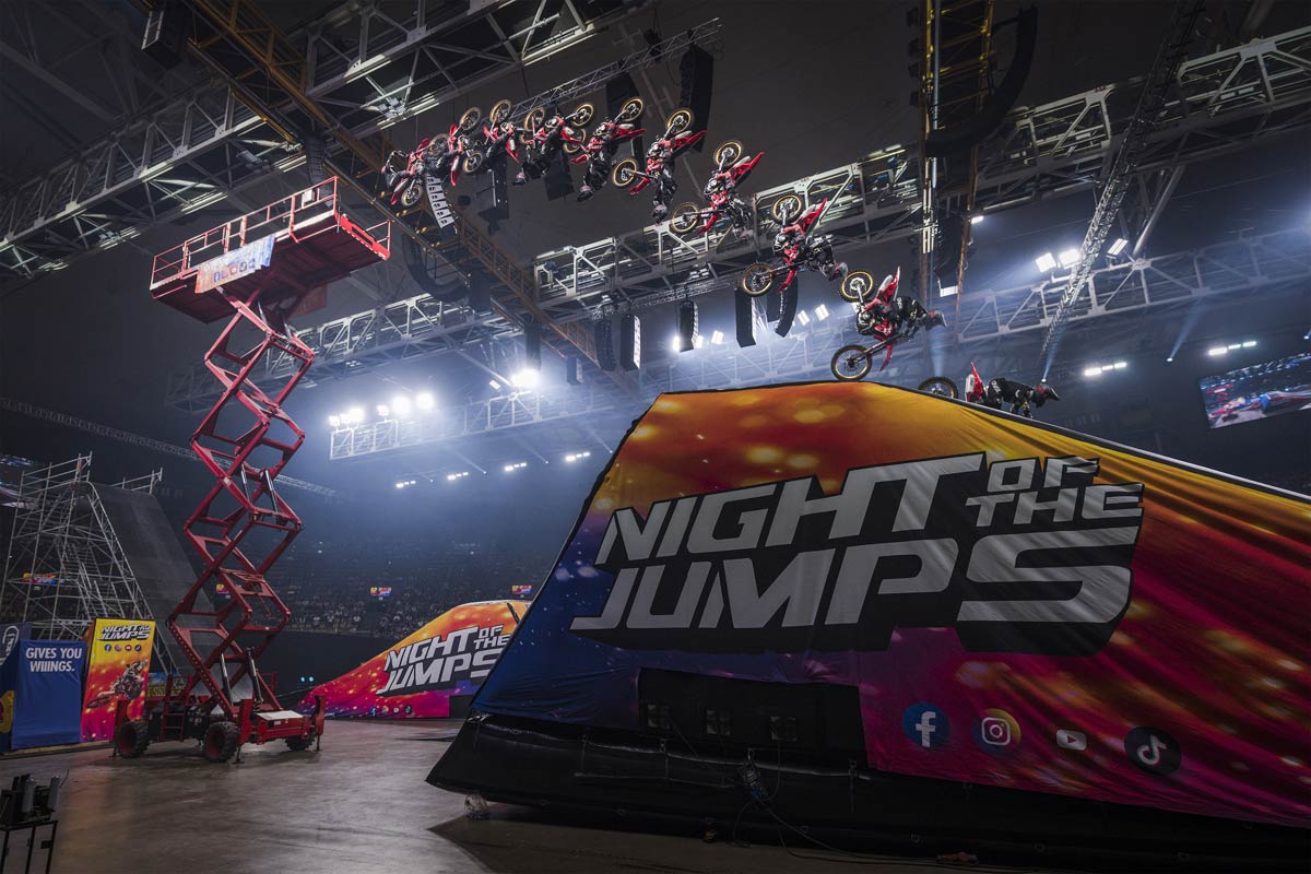 Die NIGHT of the JUMPs führte am 25. April 2026 in München die spektakuläre Freestyle‑MX‑Saison eindrucksvoll fort. Nach dem Auftakt in Berlin am 7. Februar bot die Sportserie erneut Adrenalin pur: Acht der weltbesten Freestyle‑Motocross‑Athleten sowie Spitzenfahrer aus MTB, BMX und Scooter lieferten sich mit spektakulären Tricks einen mitreißenden Wettkampf, der das Publikum begeisterte. Den zweiten Grand Prix der World Tour Championship gewann der deutsche FMX‑Weltmeister Luc Ackermann in der Olympiahalle und steigerte die Spannung für die dritte Runde der Tour am 23. Mai in Leipzig. Marc Pinyol sprang im Showprogramm vom Steigerlift einen 13 Meter hohen Backflip und stellte damit einen neuen Weltrekord auf.